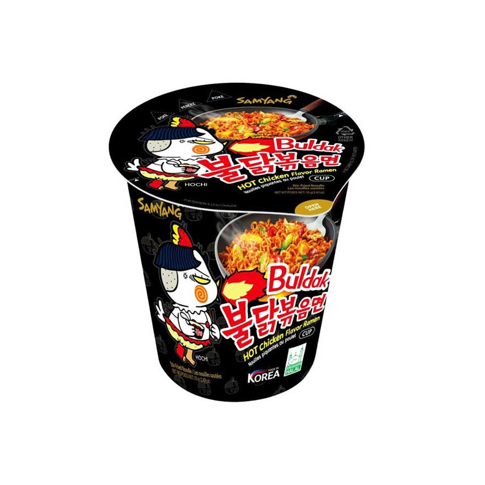 Wherever you are and just in 4 mins. you will relish this Samyang instant ramen cup, of Hot Chicken Korean Ramen Noodles, it's the best spicy Samyang chicken ramen, coming in a tasty spiciness in a bold black cup that hops over your maximum spicy levels, with a chewier and thicker texture than the classic wheat flour noodles giving the unique Korean-style ramyun.